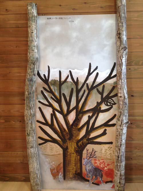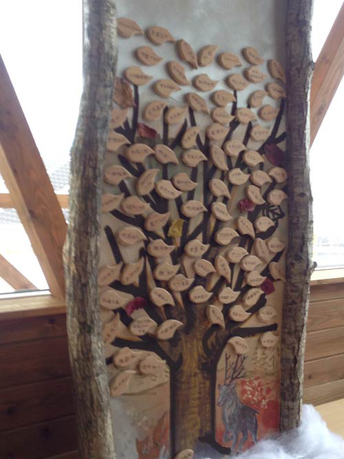 体験学習施設を併設する雄国発電所では、ご出資いただいた皆さまのお名前を記銘した葉っぱ形のリーフを地元彫刻家・若杉儀子先生が描かれた樹木に貼り付けていただきました。