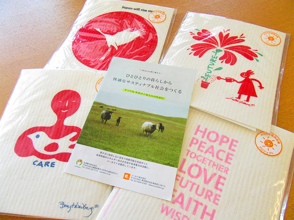 「原子力に依存しない安全で持続可能な社会作りと会津地域のエネルギー自立」を目指す弊社の取り組みにご賛同いただき、イーオクト株式会社様よりスポンジワイプ4,500枚を寄贈いただきました。