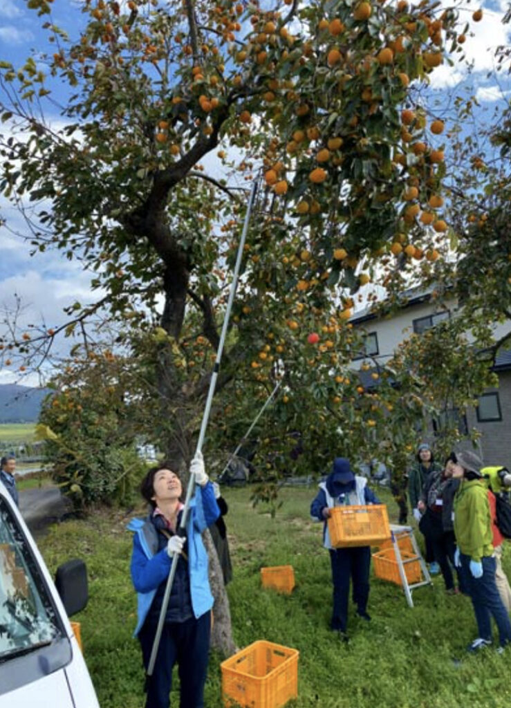 代表の山田も、高枝用ハサミを使って皆さんと一緒に収穫しています。昨年に引き続いて2回目なので慣れたもの?