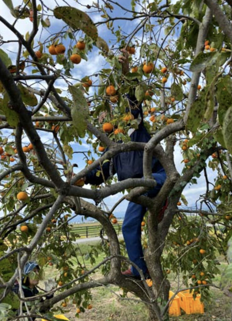 もともとは収穫しきれずに残っている柿をドロボーしちゃおう!(一応お断りしてますが)という企画でしたので、唐草模様のほっかむりのコスチュームで柿収穫体験を行いました!