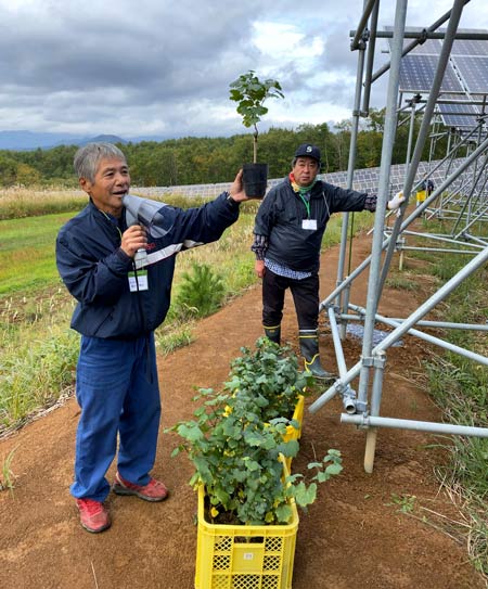 雄国発電所に移動してワイン用ブドウ苗植え、柿の渋抜き作業・箱詰め体験です。