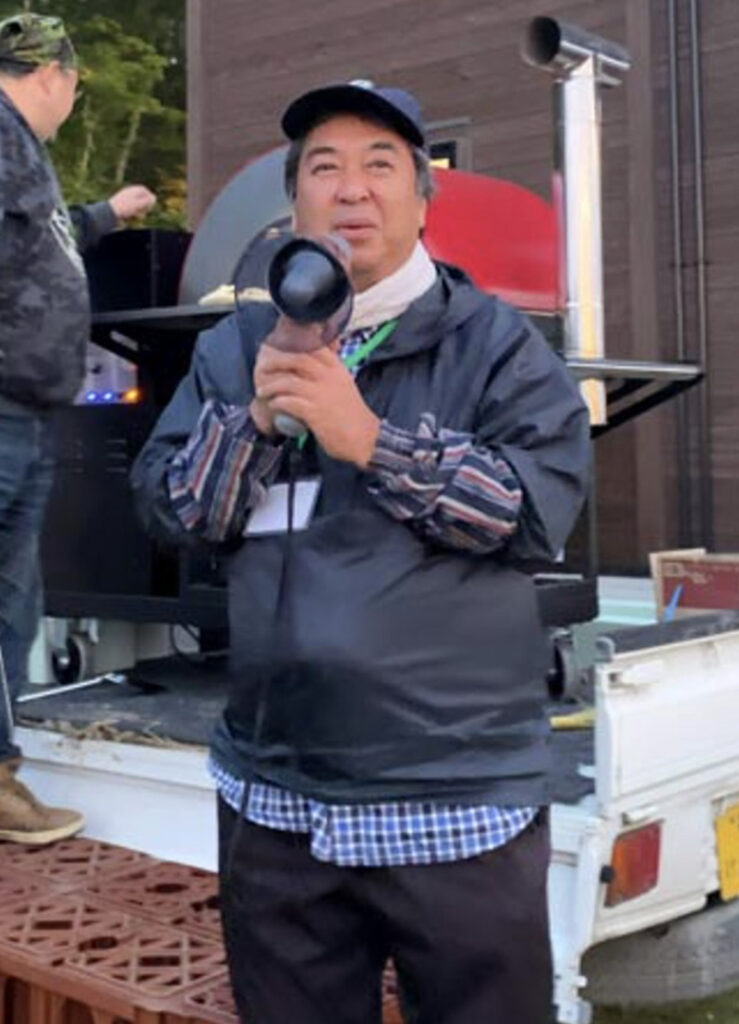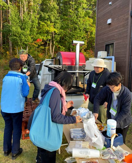 バイオマス燃料のペレットピザ窯での焼き立てピザも人気でした。料理好きな会津電力スタッフがピザを焼いています。
