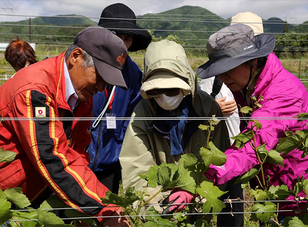 そして、皆様が一番楽しみにされていた、アイプロダクツのぶどう畑で新芽の手入れ作業をご体験いただきました。