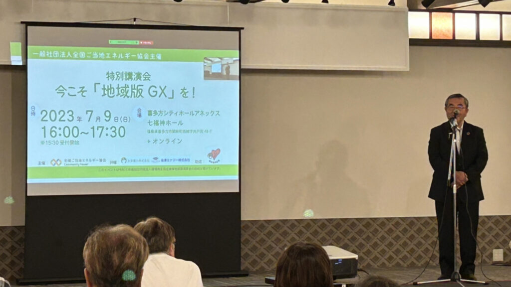 2023年7月9日(日)、全国ご当地エネルギー協会主催(共催:会津電力)の特別講演会が、喜多方市の七福神ホールにて開催されました。