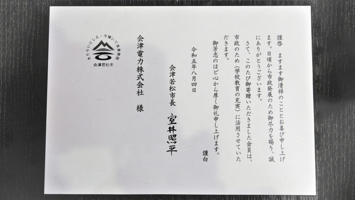 その他 会津若松市への寄付を行いました 今年も、会津若松市に寄付をさせていただきました。弊社では、学校教育の充実を願い、毎年、会津若松市への寄付を継続しています。これからも「未来の子どもたちのために」を合言葉に、地域に根ざした取り組みを続けてまいります。