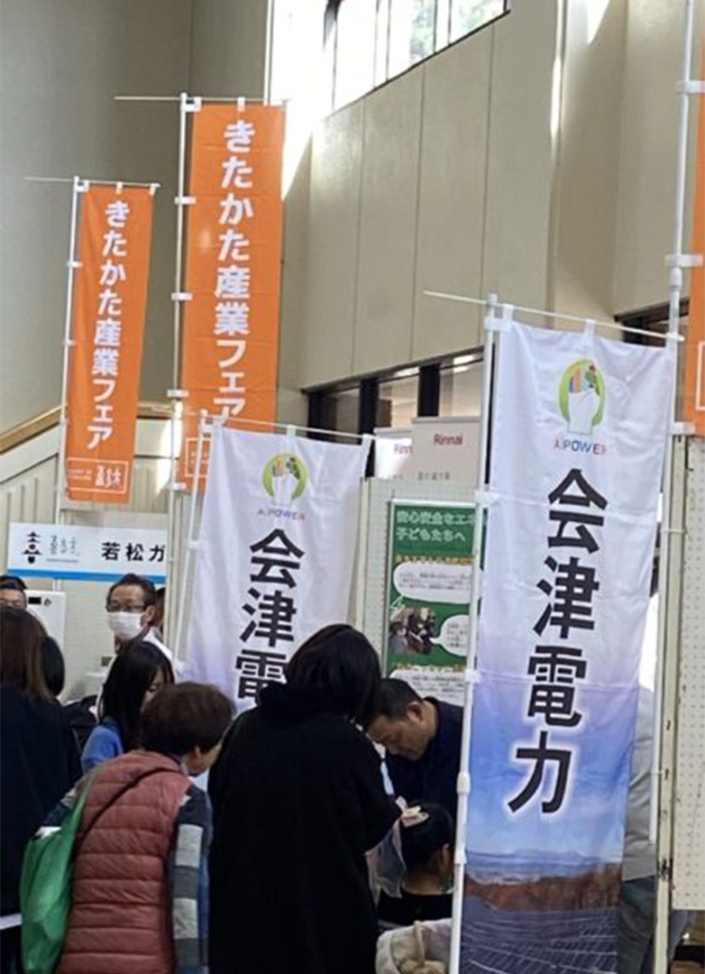 イベント きたかた産業フェアに出展しました 当日の様子1 Image 1 of 4 11月9日(土)・10日(日)の2日間、喜多方市のものづくりの技術や魅力的な商品が集結する商工業の祭典「きたかた産業フェア」が開催されました。会津電力も、地域の皆様に私たちの取り組みを知っていただくため、工業ブースに出展しました。今年は「ソーラーツリー」の工作体験を実施し、子どもから大人までたくさんの方々にご参加いただき、大盛況となりました。お立ち寄りくださった皆様、ありがとうございました!